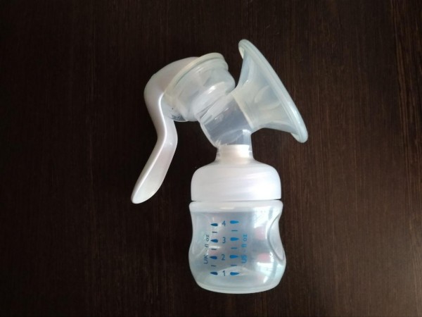 Так выглядит механический молокоотсос. Чтобы сцеживаться нужно часто жать на рычаг. Бывают еще электрические, они все делают сами.
