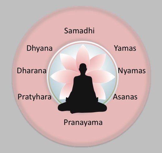Патанджали выделял в йоге восемь ступеней: яма, нияма, асана, пранаяма (контроль дыхания), пратьяхара (освобождение ума от власти чувств и внешних объектов), дхарана (концентрация), дхияна (созерцание) и самадхи (состояние сверхсознания, наступающее в результате углубленной дхияны, когда адепт сливается со Вселенским Духом).