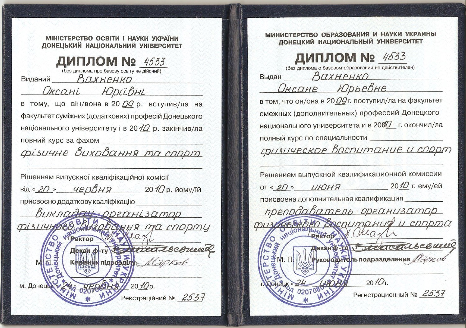 2010 - получила диплом ФСДП ДНУ по специальности "Преподаватель-организатор физического воспитания и спорта".